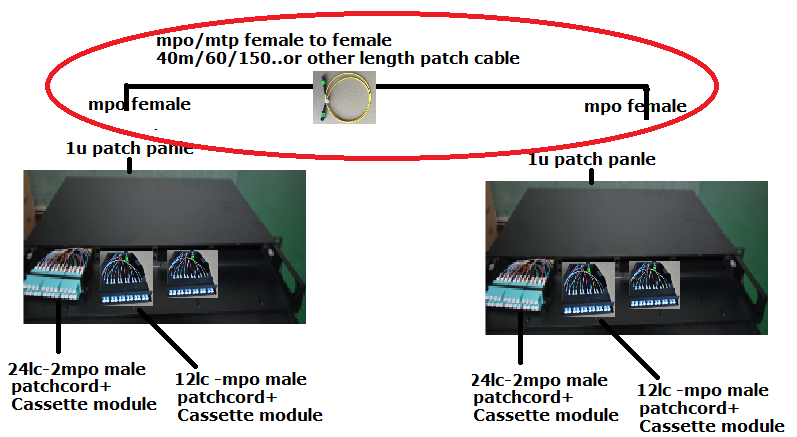 Schematic Diagram of MPO/MTP Female - to - Female Fiber Optic Patch Cord Connecting 1U Patch Panel System